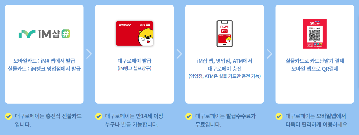 실물카드를 선호하시는 분들은 iM뱅크 영업점을 방문하거나 iM샵 앱을 통해서도 신청할 수 있어요. 실물 카드는 일반 신용/체크카드처럼 카드 단말기를 통해 결제할 수 있어서 오프라인 사용이 더욱 편리하겠죠? 대구로페이 발급 수수료는 무료이니 부담 없이 신청하셔도 좋답니다. 💳