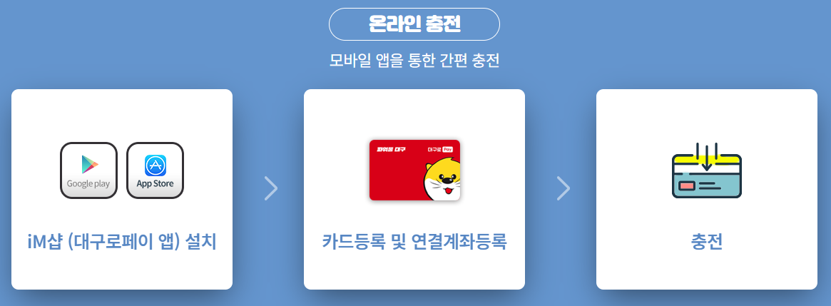 온라인 충전은 iM샵 앱을 설치한 후, 카드를 등록하고 연결 계좌를 설정하여 간편하게 충전할 수 있어요. 💫 언제 어디서든 스마트폰만 있다면 대구로페이 충전이 가능하니, 바쁜 일상 속에서도 편리하게 이용할 수 있겠죠?