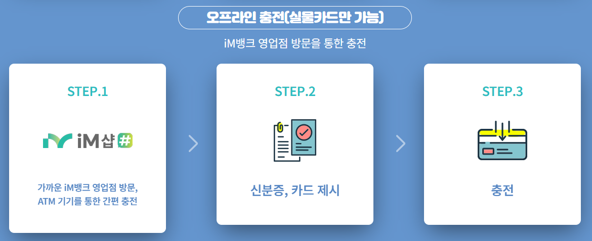 오프라인 충전은 실물카드에 한해 iM뱅크 영업점이나 ATM 기기를 통해서도 가능해요. 가까운 영업점에 방문하시거나 ATM 기기를 이용하시면 실물카드에 직접 대구로페이 충전을 할 수 있답니다. 신분증과 카드를 제시하면 충전이 이루어져요. 🏦